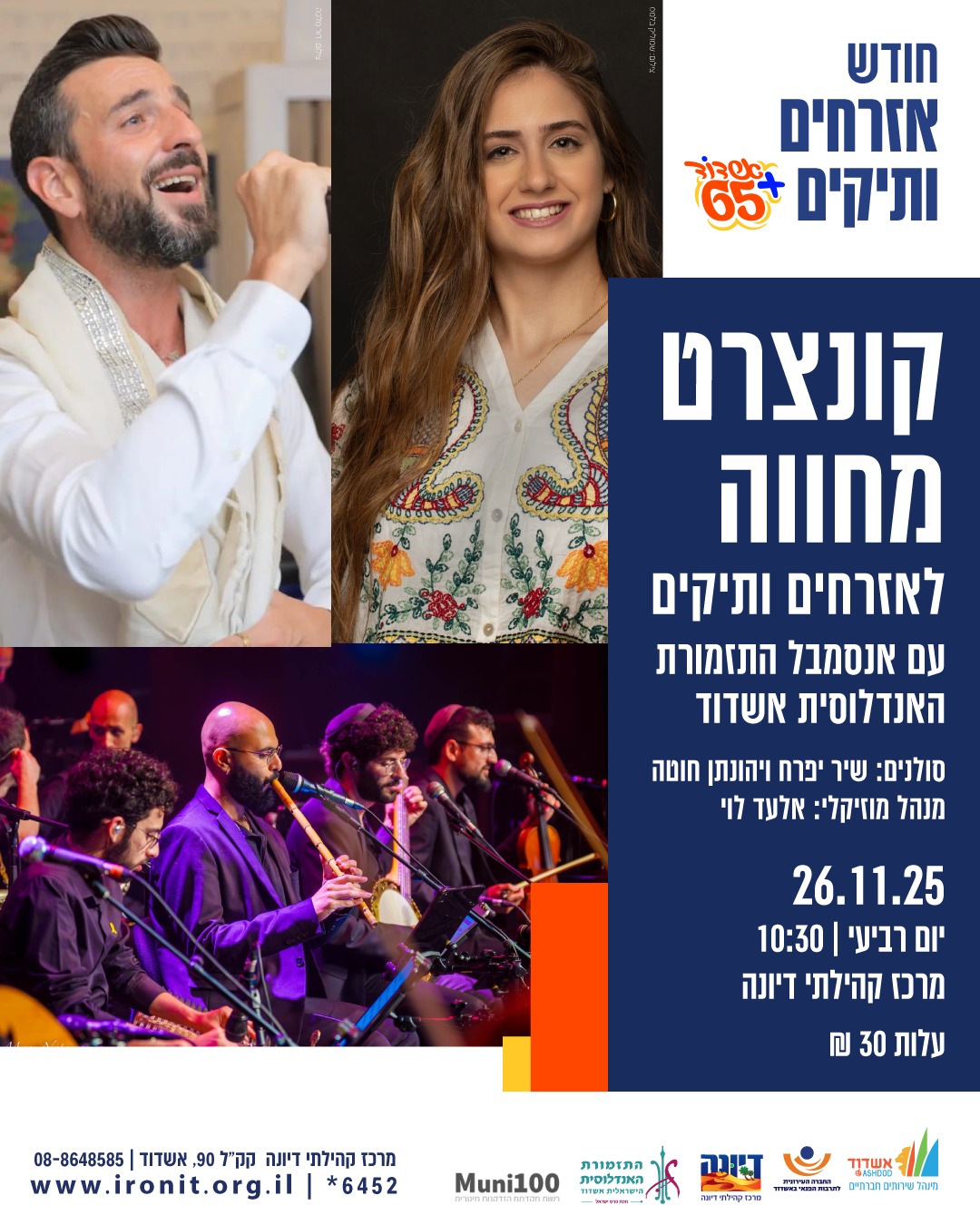 עיריית אשדוד והתזמורת האנדלוסית הישראלית גאות להזמינכם לקונצרט במסגרת חודש ההצדעה לאזרח הוותיק.